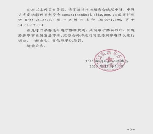 为保证赛事公平公正、树立良好赛风赛纪,组委会在第一时间约谈了跑团组织者,现遵照《2025深圳马拉松竞赛规程》里第十一条竞赛办法的(十一条)的第8条“比赛中采用挤人、推人、撞人、绊人等犯规行为的”和第21条“其他违反比赛规定的行为的”,根据各选手的违规和不良行为的情节严重程度,给予以下处罚: