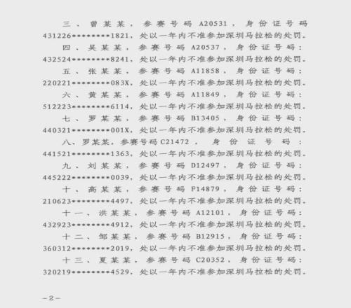 十一、洪某某,参赛号码A12101,身份证号码:432923********4912,处以一年内不准参加深圳马拉松的处罚。